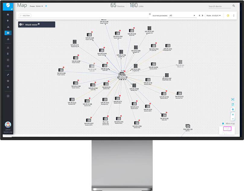 Radiflow iSID’s network map, down-drillable to all device properties, vulnerabilities and inter-device attack vectors