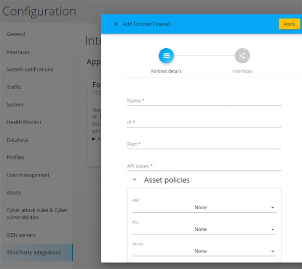 Linking between iSID and FortiGate and configuring firewall rules for different asset types is quick and easy – simply enter the identifiers of the FortiGate firewall (Name, IP address, Port and API token, source interface and destination interface), hit enter, and you’re done. Then, for each available asset type (HMI, PLC, Server, Router, Historian, OPC Server and Engineering Station) the user is able to select a behavior: None, Block and Allow.