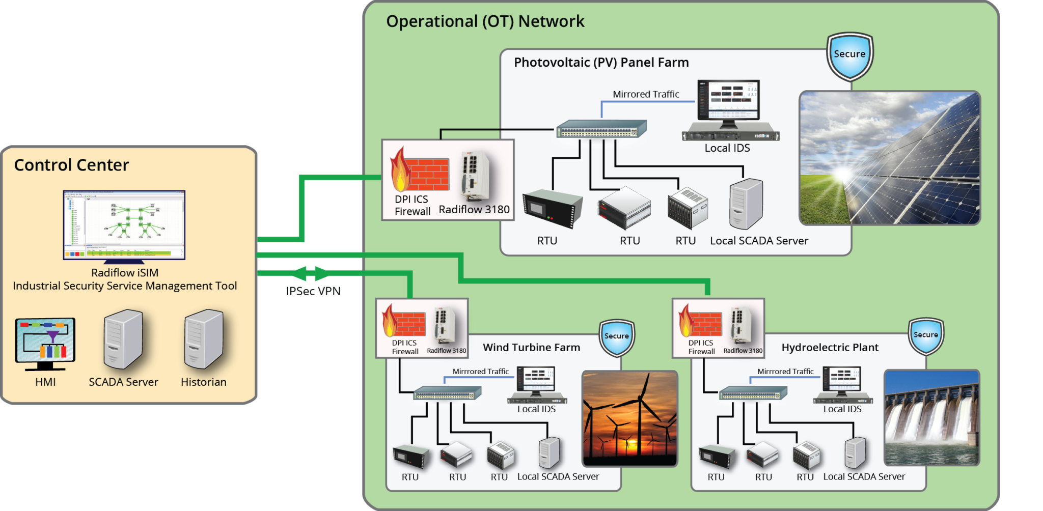 • VPN: end-to-end IPsec VPN for secure communications between the control center and the photo-voltaic field.